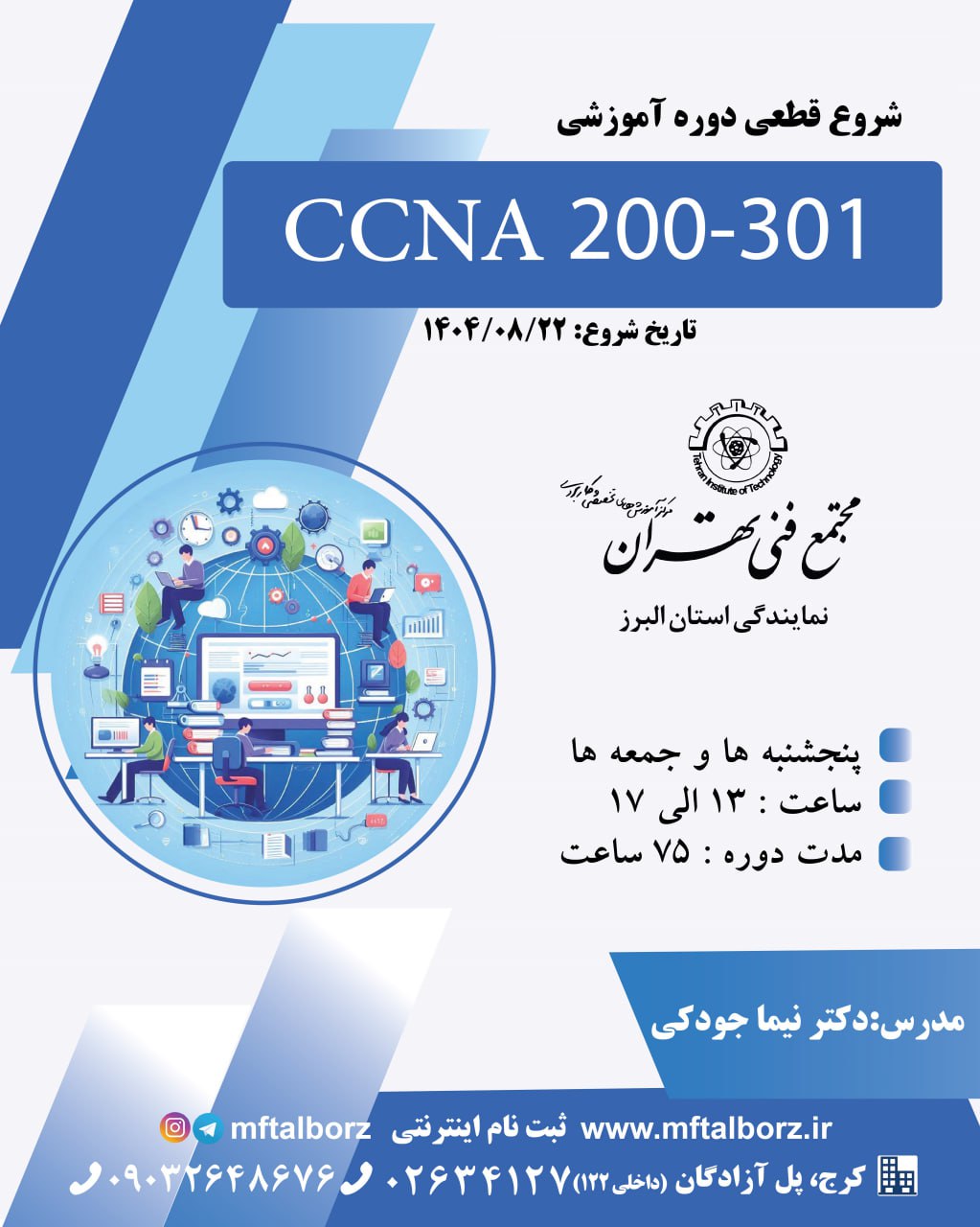 دوره CCNA 200-301 در گروع شبکه و امنیت دپارتمان فناوری اطلاعات و ارتباطات (ICT) از روز پنجشنبه 22 آبان ماه شروع می شود. مدرس دوره آقای نیما جودکی خواهند بود. مخاطبین دوره علاقمندان به حوزه شبکه و دانشجویان و فارغ التحصیلان رشته های کامپیوتر (نرم افزار و سخت افزار) می باشند. مدت این دوره 75 ساعت است. سرفصل دوره عبارتست از: